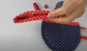 - Сглобете совата. Пришийте канта към грешната страна на изделието, като оставите горната част. Обърнете тапицерията на лицевата страна и я зашийте.