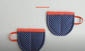 - Оформете дръжките, като сгънете модела в средата на късата страна навън. Шев по протежение на ръба на дългата страна, обърнете. Поставете втулката в дръжките.