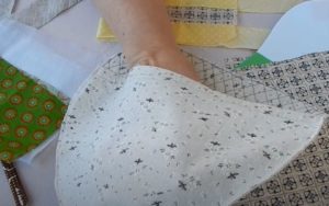 - Вземаме плат за основата, синтепон и изрязваме 2 парчета от тялото и 4 от крилата, като следваме шаблона.