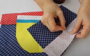 - Притиснете малък квадрат с размери 3х3 см в центъра. Вземете парчета яркожълто, червено или зелено и ги зашийте в кръг, като редувате сгъване, докато запълните цялата повърхност. Препоръчително е да изгладите резултатите от работата веднага или да използвате линийка.
