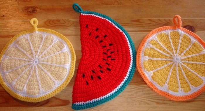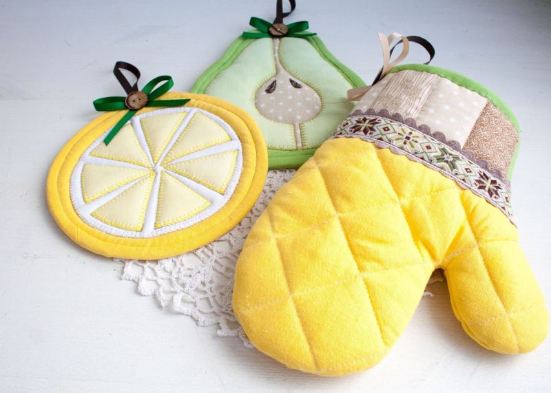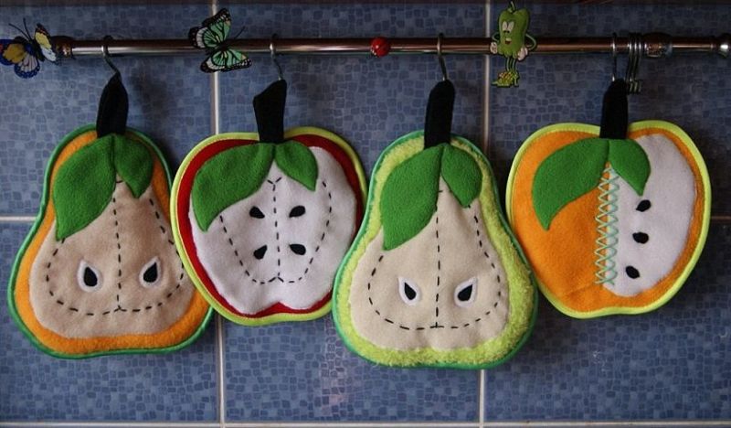 Ярките атрактивни ръкавици под формата на плодове не само ще украсят кухнята, но и ще напомнят на студената зима за топлото слънчево лято.