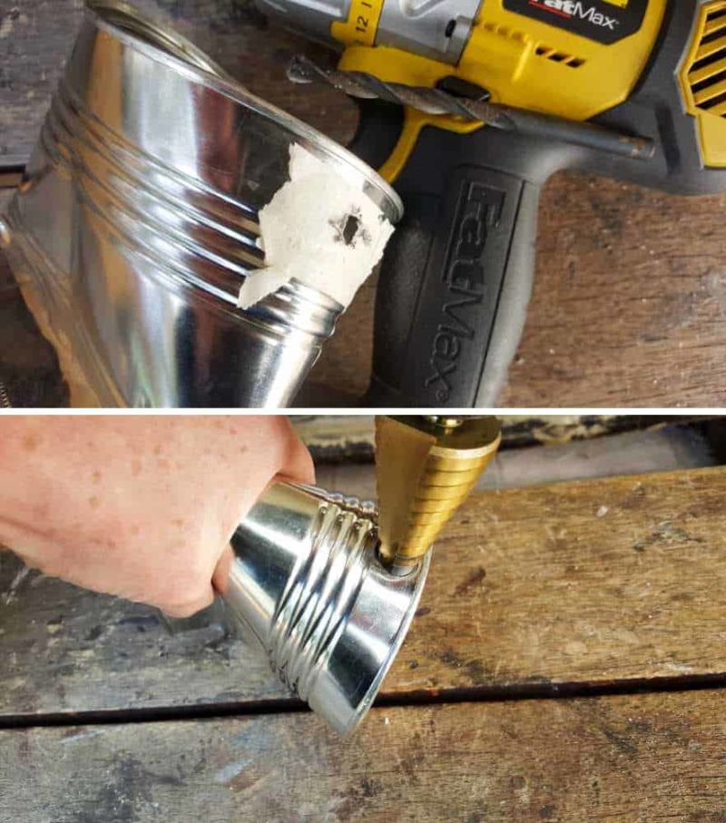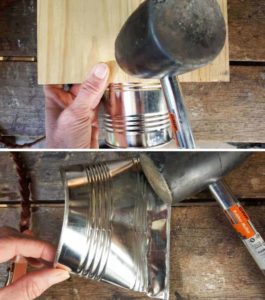 - Отстранете етикета от кутията. За да ни е по-лесно да извадим остатъците, накиснете буркана в топла вода за няколко минути. Обърнете буркана и с помощта на пирон и чукче направете няколко дупки на дъното. Боядисайте буркана в желания от вас цвят. Оставете да изсъхне.