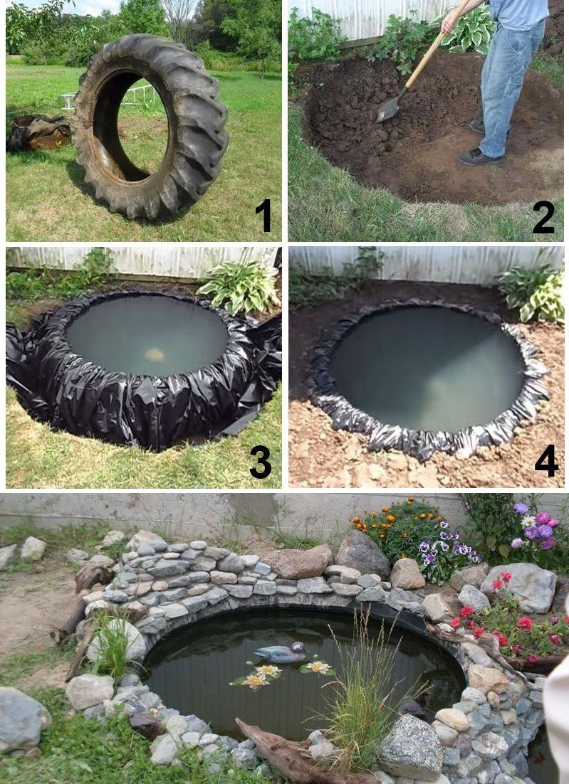 От стари гуми може да се направи истинско езерце. Можете да поставите камъни и да засадите водни растения около него. Той е чудесен басейн за деца и възрастни в горещ летен ден. За езерото ще ви е необходима голяма гума от специален автомобил.