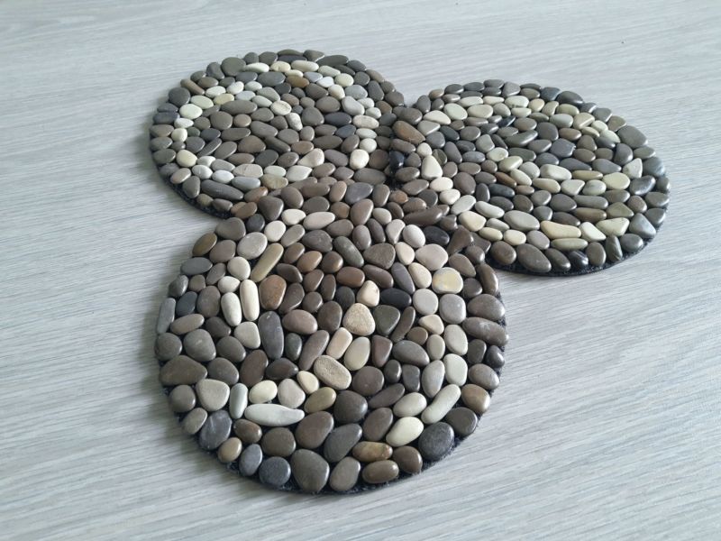 Подложката от камъчета е друго интересно творческо решение. За подложката първо трябва да сглобите камъчета. За основа можете да използвате гумирана тъкан, филц или килим. Използват се и дървени и коркови основи.