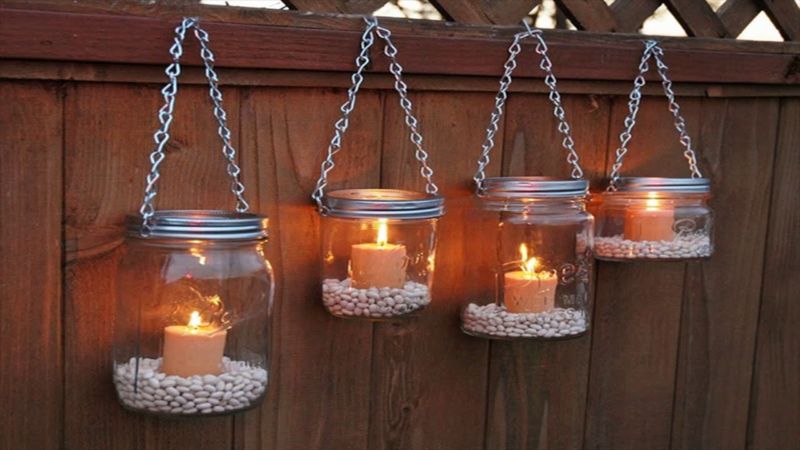 Направете примка в края на връвчицата, за да закачите буркана на пирон или кука. Пресадете растенията в саксиите. На дъното на саксията може да се постави шепа малки камъчета за по-добро отводняване. Поливайте висящите растения пестеливо, за да не капят. Саксиите могат да бъдат украсени с техниката декупаж.