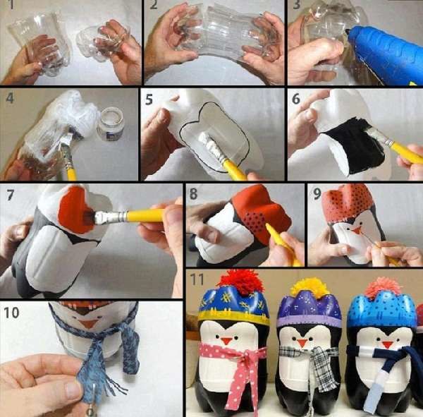 Като начало можете да изработите пингвин от пластмасова бутилка и да го боядисате с акрилна боя. Проста изработка е поставка за моливи. Необходими са ви обикновена кутийка, лепило и цветни копчета, за да я направите.