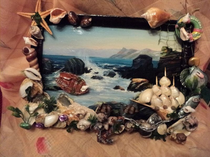 Купете няколко дървени рамки в магазина и залепете върху тях малки мидички. Такива ексклузивни рамки за снимки или огледала ще украсят всяка стая.