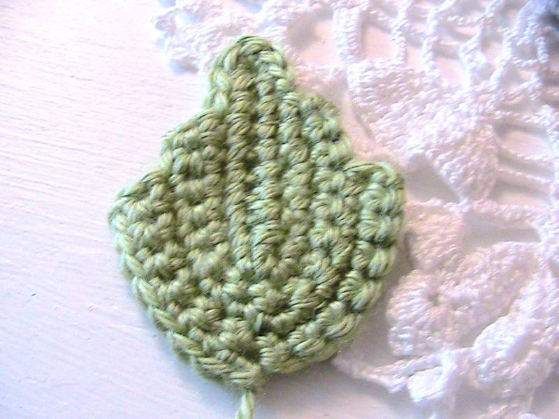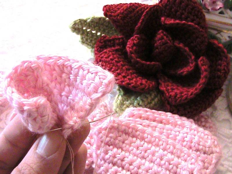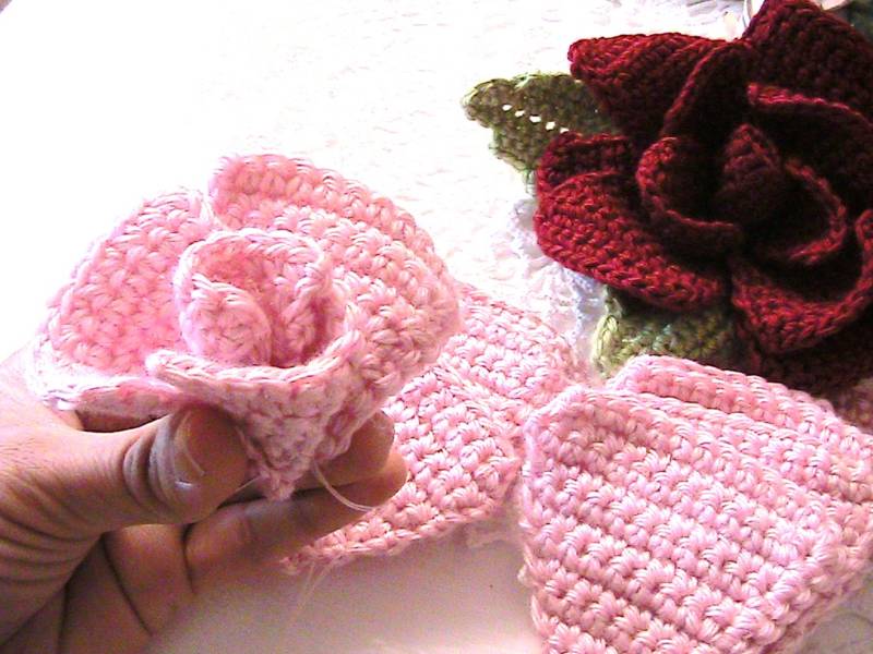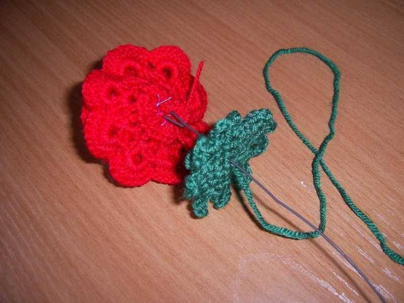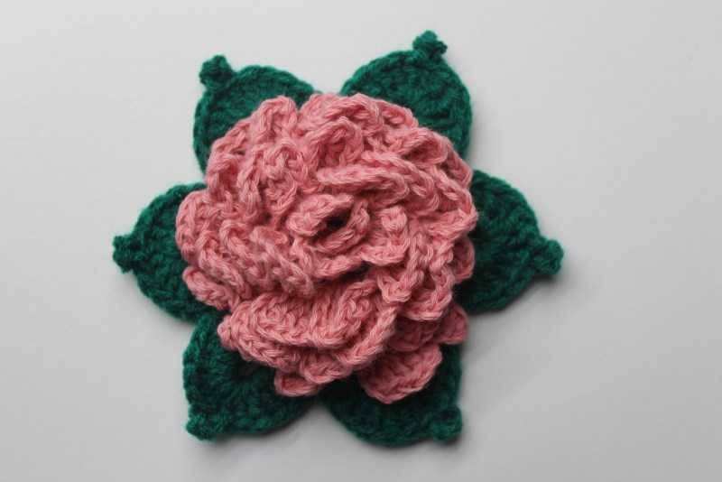 Когато изплетете желания брой листа, можете да ги пришиете към дреха или домакински предмет и да поставите отворен розов цвят отгоре.