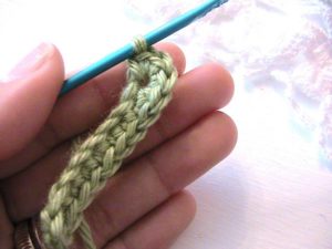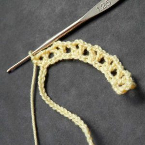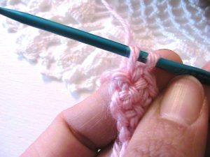 - Вторият ред е връщане от ръба към първата бримка, като се използват прости колонки.