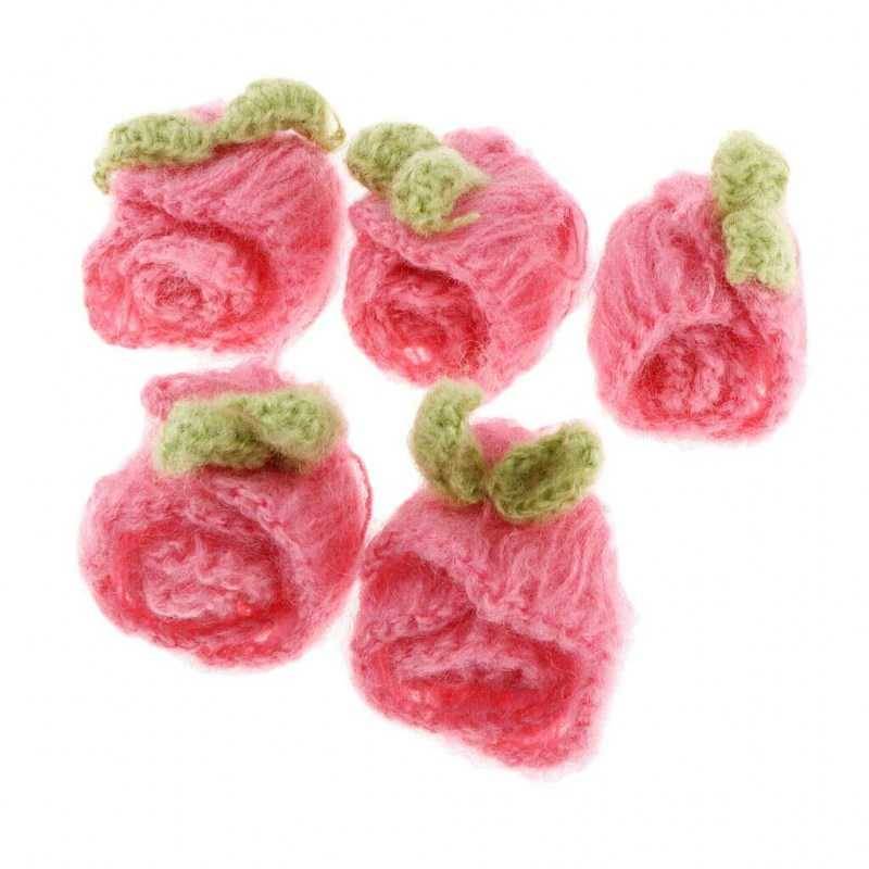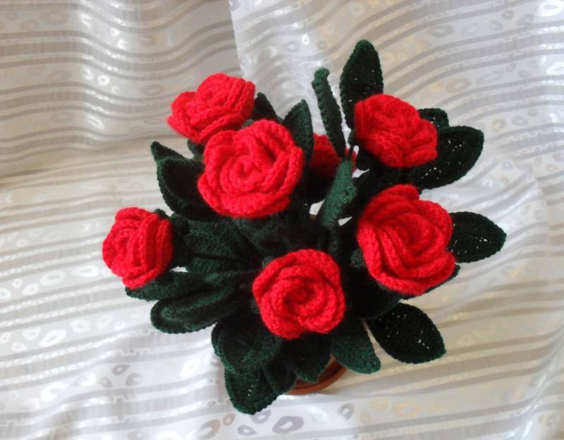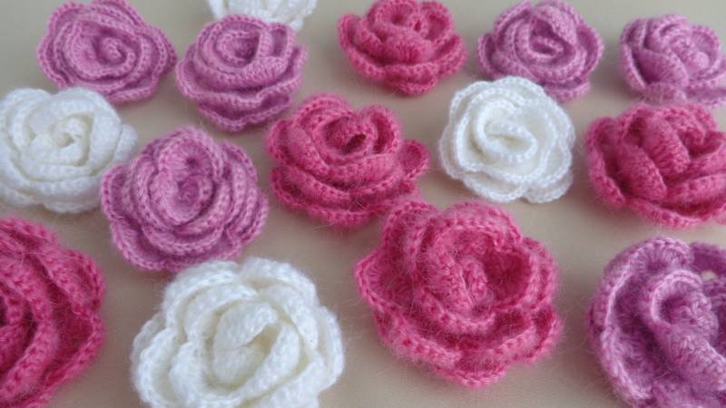Малките плетени рози изглеждат красиво върху възглавници за диван, стенни пана, в букети от сухи цветя.
