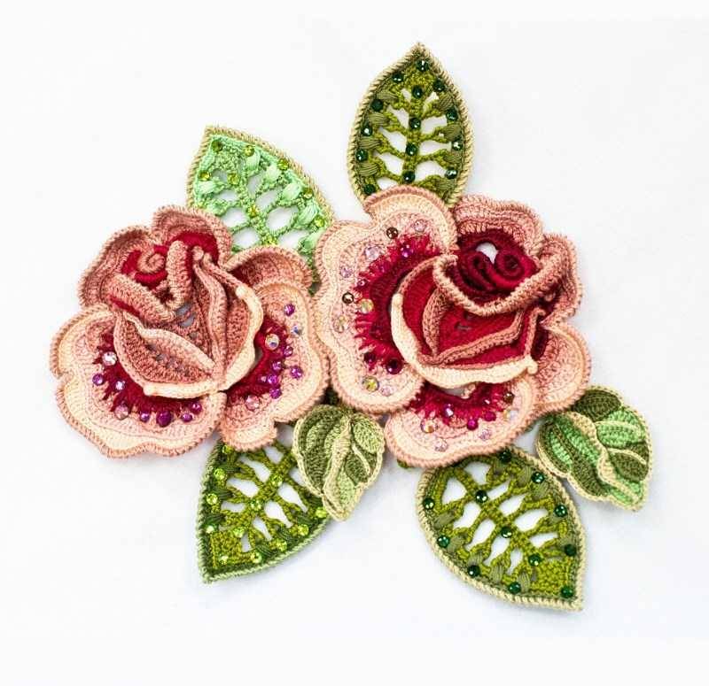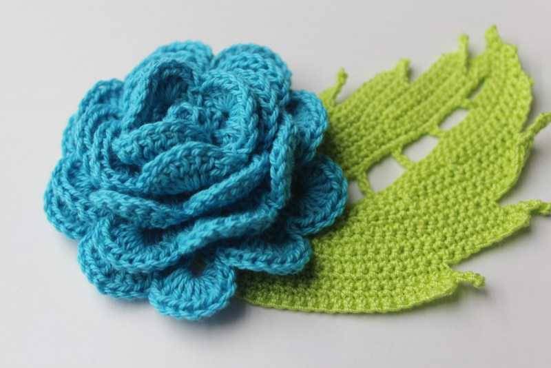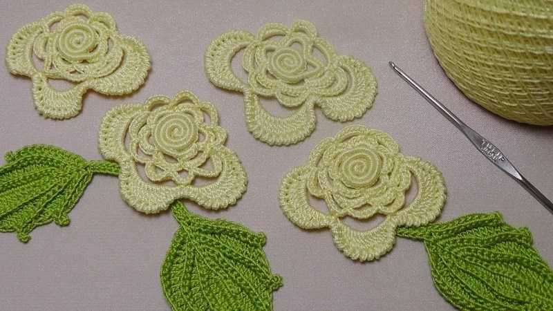 Цяла цветна композиция за украса на декоративни възглавници, сламени чанти или шапки може да се изработи, като се изплете на една кука ярко оцветена роза върху зелени листа.