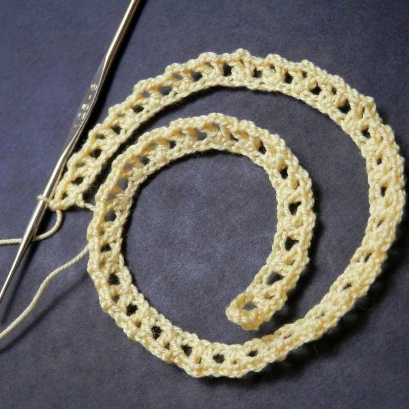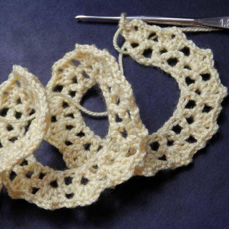 Всяка схема за плетене на права дантела също ще свърши работа, стига да е направена с вълнообразен ръб, който добре имитира заоблените краища на венчелистчетата, когато готовата лента е сгъната на спирала.
