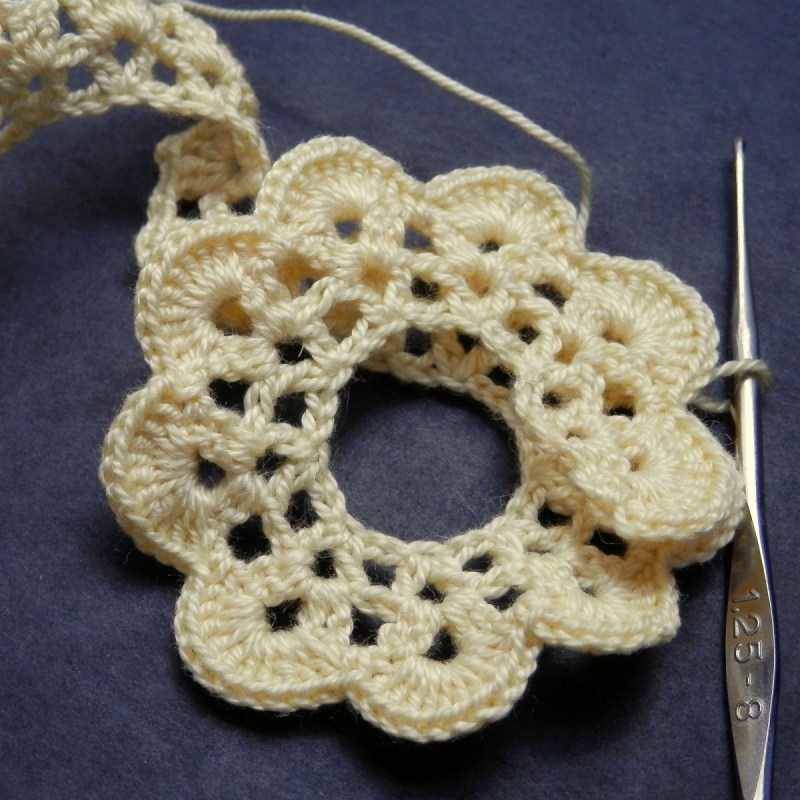 Ако постепенно увеличавате броя на бримките в следващия ред с по 1 блуждаеща бримка между тях, дантелата ще бъде още по-добре спираловидна.