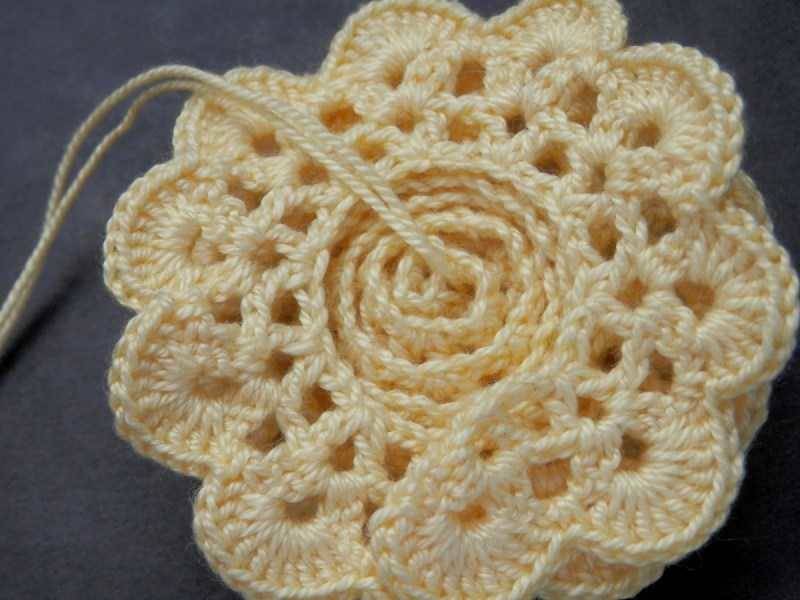 За да стане розата ажурна и венчелистчетата да се разпръснат встрани като истинско цвете, от ред 3 трябва да се получат 6 колонки от всеки въздушен дъговиден бод между колонките. Четирите средни реда трябва да се изплетат с двуредни бримки, а двете крайни бримки на всеки шести ред - с едноредни бримки.