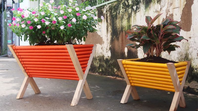 - Отгоре се поставят саксии с цветя.