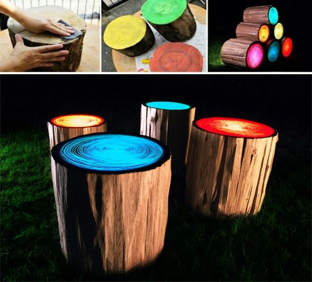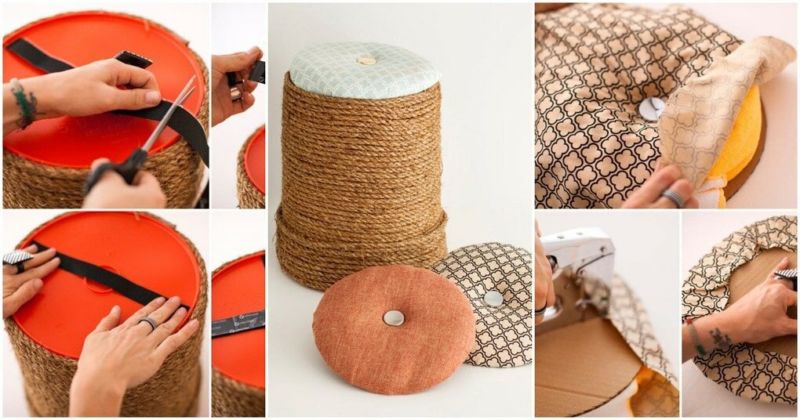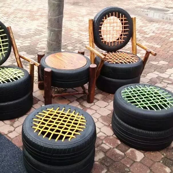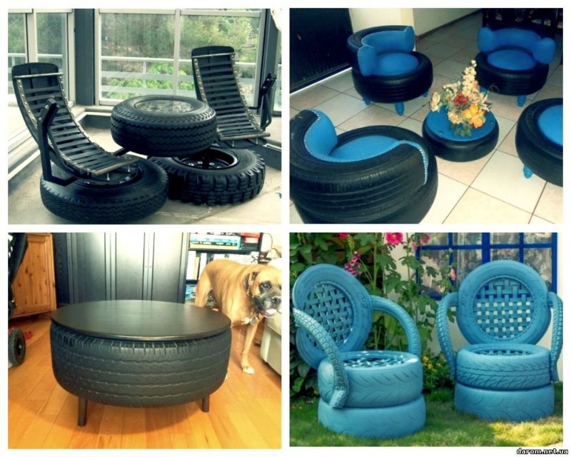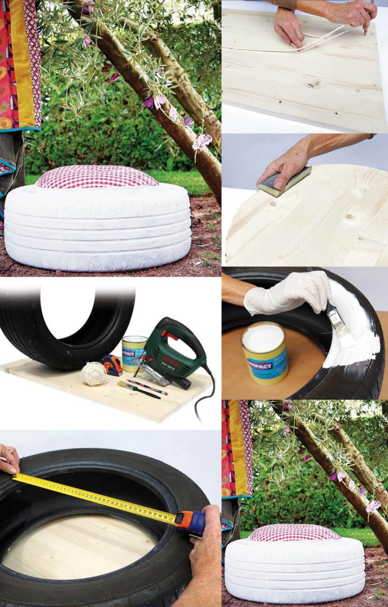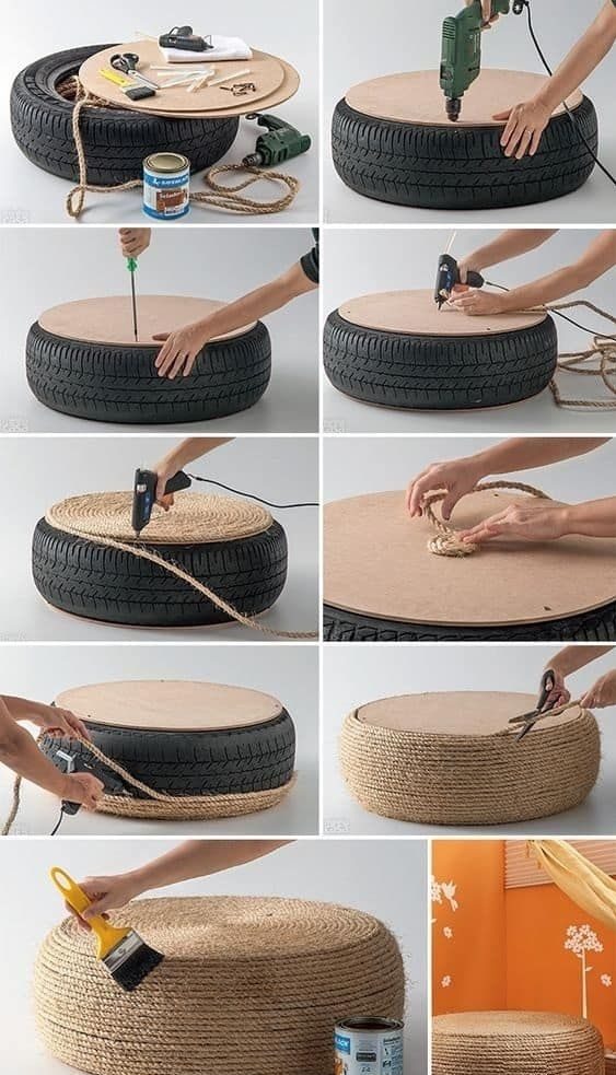 Тези пуфове са идеални за стилната маса по-горе. Трябва да обработите старите гуми, да ги боядисате и да ги оставите да изсъхнат. Вътрешната част е запълнена със строителна пяна, а външната - с гумена пяна.
