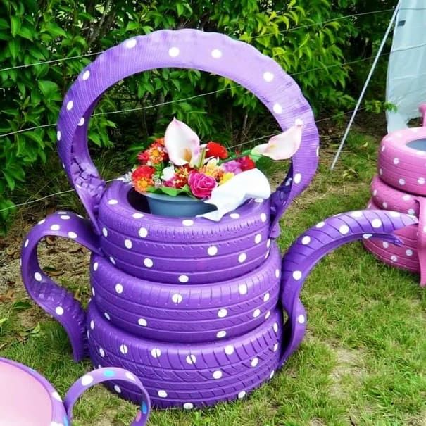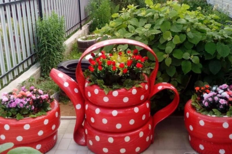 - Животни от гуми - скучните цветни лехи могат да се превърнат във фигури на лебеди, приказни герои.