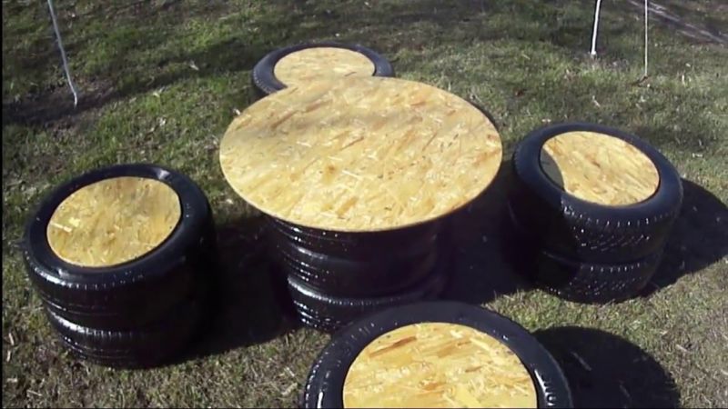 Шперплат, изрязан в кръгла форма. Той се залепва към гумата, която трябва да бъде предварително боядисана или облицована с плат. Масата е достатъчно висока, за да се играят настолни игри или просто да се седи. От малки гуми могат да се направят миниатюрни столове или пуфове.