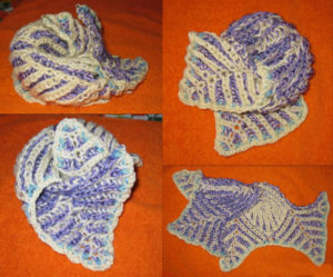Започва с вариация на класическата "папрат" и в процеса на работа се превръща в бордюр от пухкави листа, а след това завършва с копчета, затворени с кука.