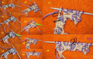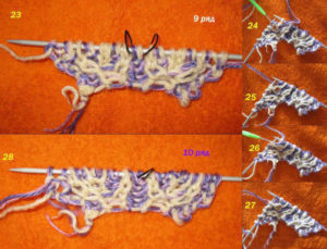 - Следващият ред се плете по модела, но при създаването на всяка дупчица трябва да се направи допълнителна дупка от кръстосания конец.