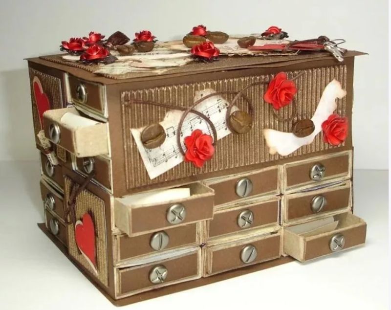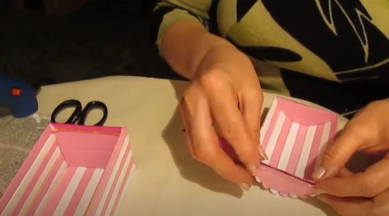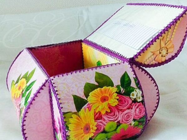 Основният фокус е да се направи капакът. Това може да бъде картонена част, която е по-голяма от основната част. Можете да направите декоративна дръжка в горния край на капака или да прикрепите оригинална украса.