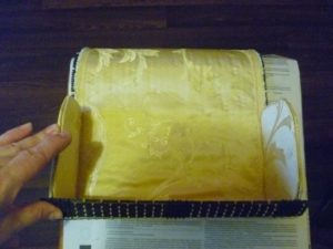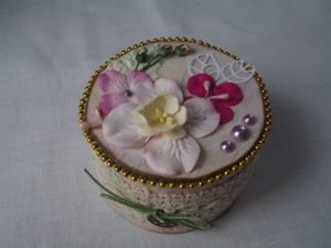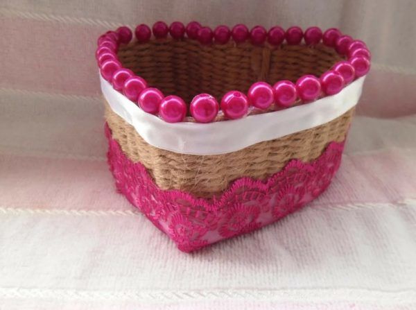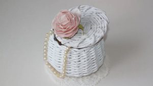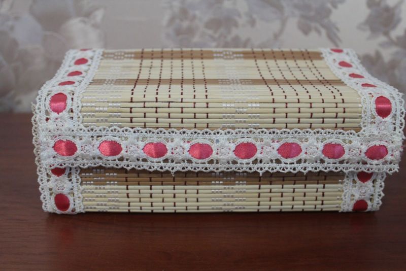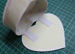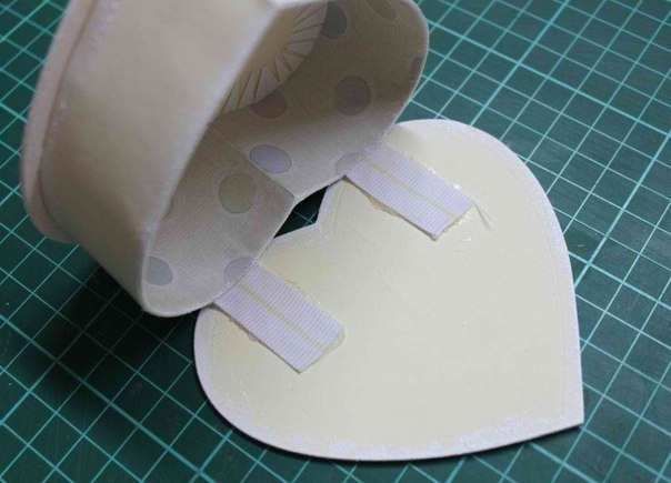 - Прикрепете дъното наведнъж, а за капака направете допълнителен страничен волан. Това може да бъде картон или волан, изработен от плат, гипюр или декоративна фасета.