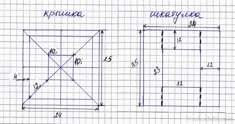 - Размерите на самия аксесоар, включително височината на стените, ширината и дължината на дъното. Капакът е показан като отделен елемент, тъй като ширината му трябва да е по-голяма от размерите на основата.
