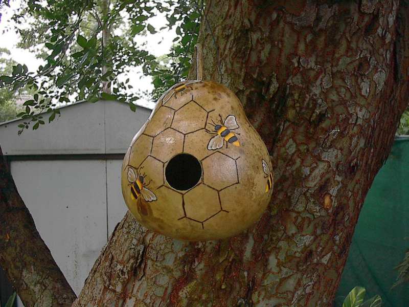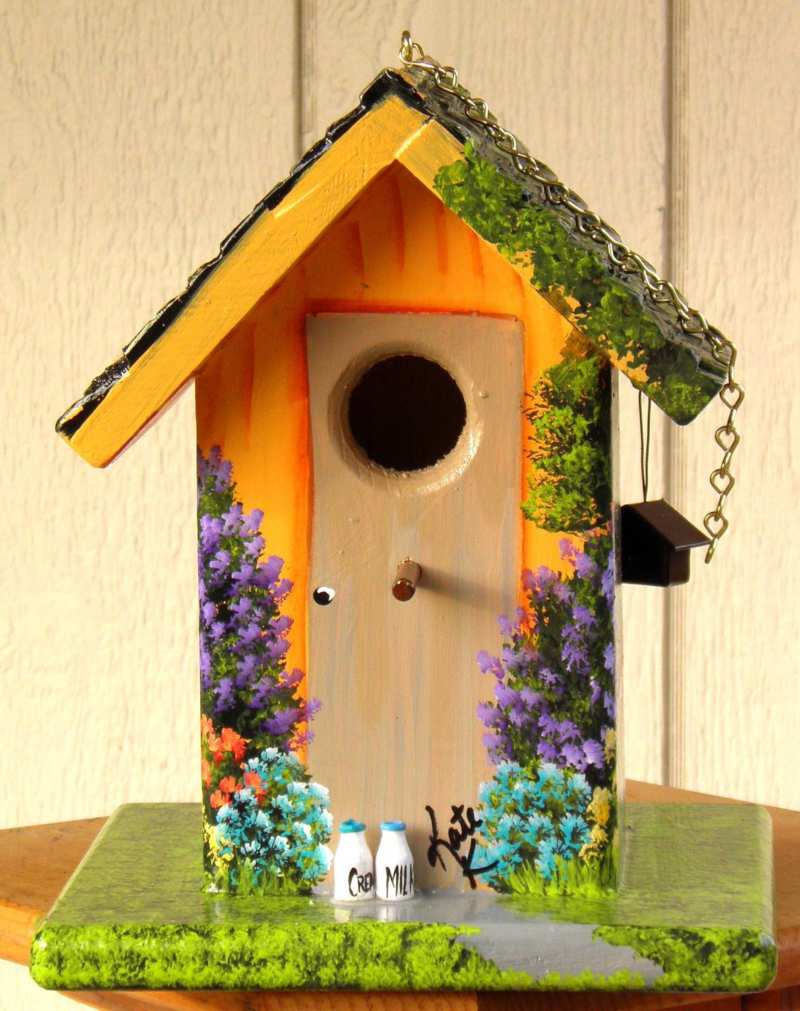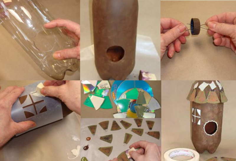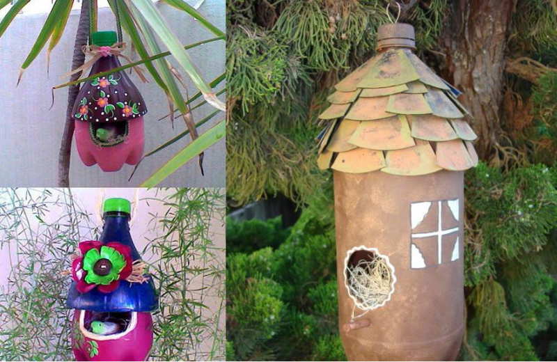 Можете да направите къщичка за птици и от пластмасови петлитрови бутилки, но тя трябва да бъде боядисана със светла акрилна боя, за да не е прекалено горещо на птиците.