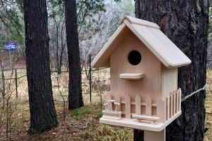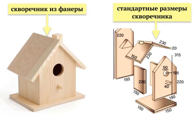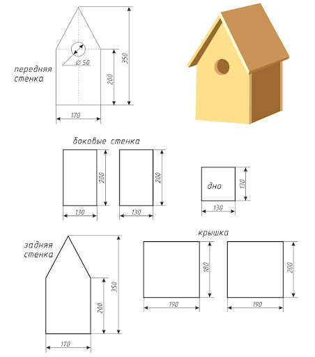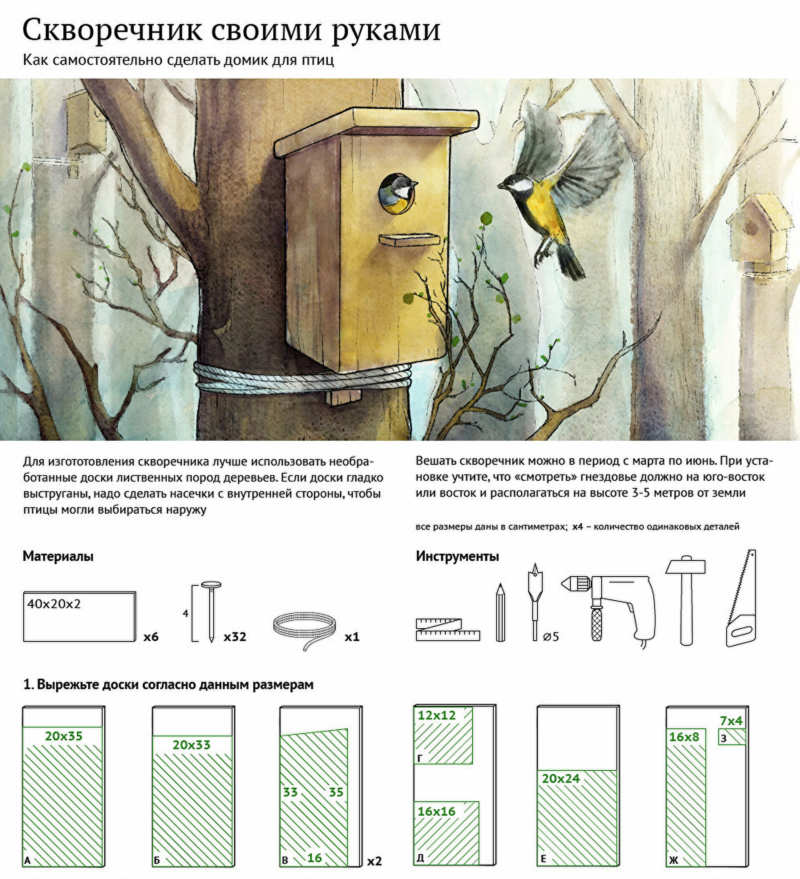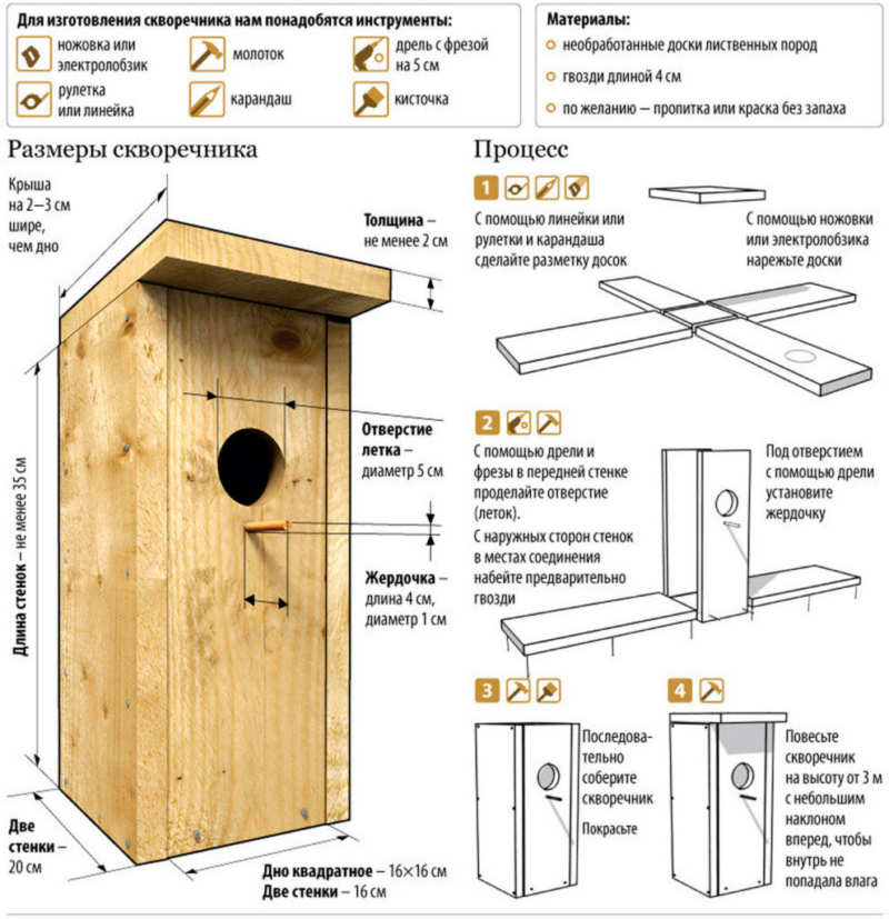 За по-големи птици височината на къщичката се увеличава до 40 см. Най-добрата дебелина за дъска за къщичка за птици е 2 см.