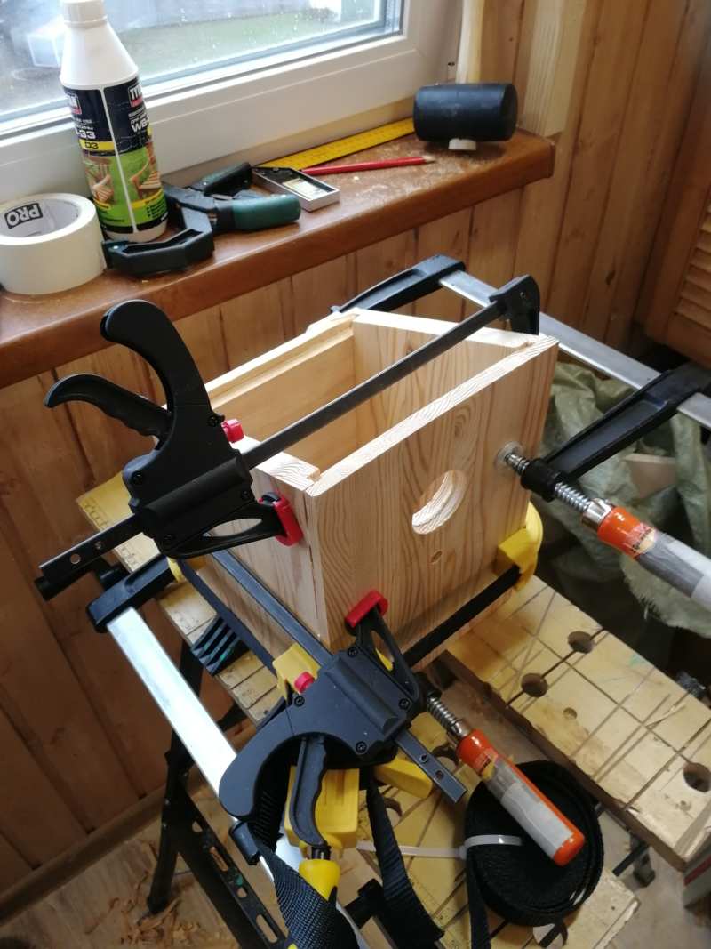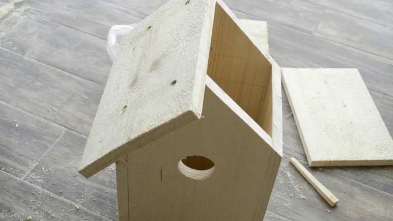 - Сглобете рамката на къщичката за птици, като съедините всички стени. За да предотвратите напукване на дървото при забиване на пирони или винтове, предварително пробийте дупки.