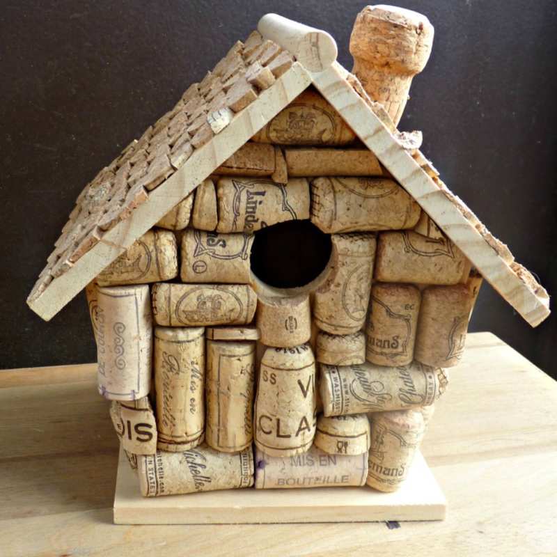 Можете да си направите топла къщичка за птици от винени тапи. Ако имате време и желание, можете да направите уютен дом за птиците. Можете да направите къщичка за птици от тънък дървен материал и да залепите върху нея тапи или да направите рамка от летви и да залепите върху нея винени тапи.