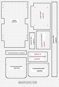 Особеност ще бъде наличието на капак. Това парче се изрязва и зашива допълнително и се прикрепя към горната част на гърба. Обикновено този елемент трябва да бъде допълнително укрепен чрез лепене.
