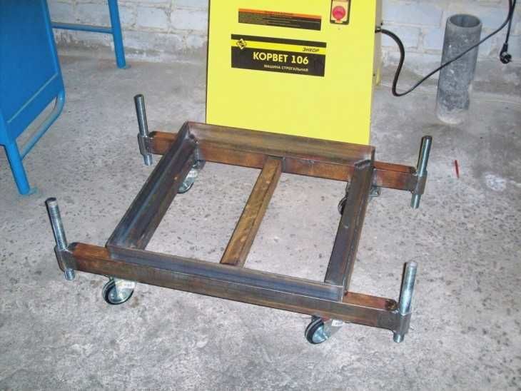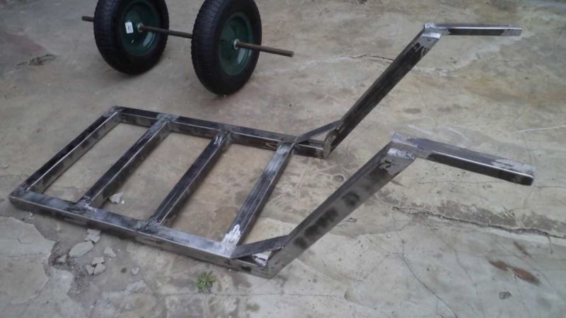 Основната част на устройството е готова, сега основата на колелото може да бъде заварена или завинтена към нея. Основата на колелата на количката е изработена от профилна тръба. Тогава ще ви е необходимо: