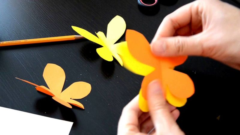 Когато създавате картина на насекоми, изберете елементи с прости форми. Ажурните крила на пеперуда с елементи на папийонка са по-подходящи за по-големи деца в предучилищна възраст. По-малките деца е добре да направят пеперуда със симетрични триъгълни крила със заоблена форма.