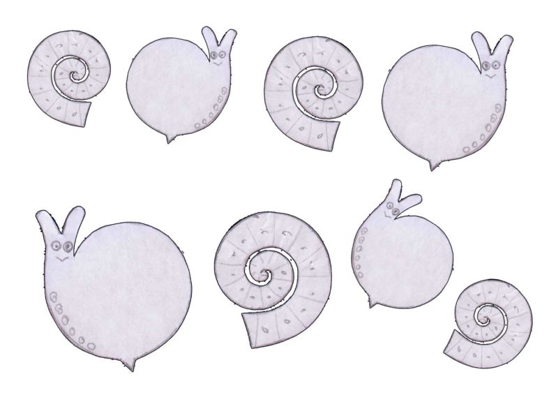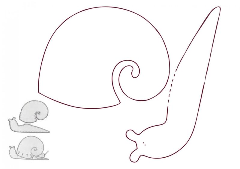 Простият шаблон за охлюв, състоящ се от тяло и черупка, е лесен за направа на симпатичен с големи очи и мигли. Спираловидната обвивка може да бъде допълнително украсена с напречни ленти.