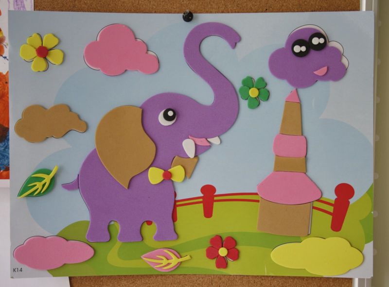 Съвет! Позволете на детето си да бъде самостоятелно и му дайте възможност да избере цвета и подредбата на картинките. Той умее да допълва цялостната композиция със слънце, облаци, трева или цветя.