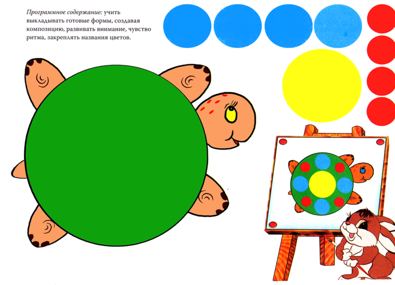 Най-лесната техника е да се нанасят цветни кръгове. Тя помага на малкото дете да разбере цялото, състоящо се от еднакви фрагменти.