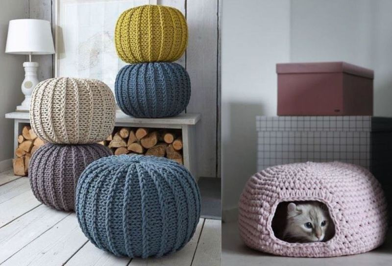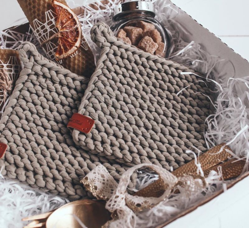 Ръкавиците често се използват като декоративни елементи в кухнята. Можете да предложите голям брой варианти. Предимството им е, че плетената прежда, която е с голяма дебелина, не се нуждае от вътрешен слой.