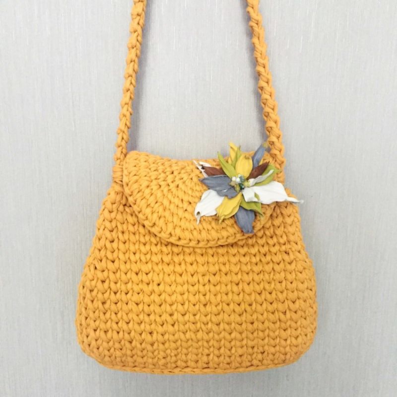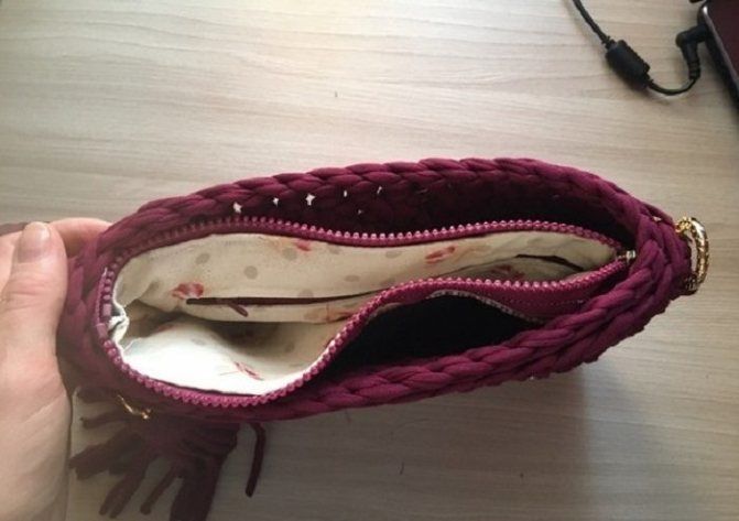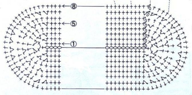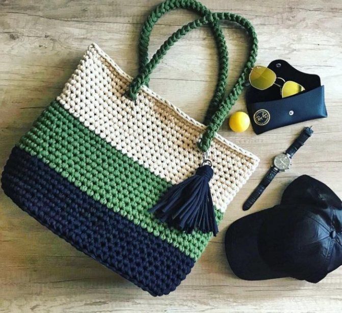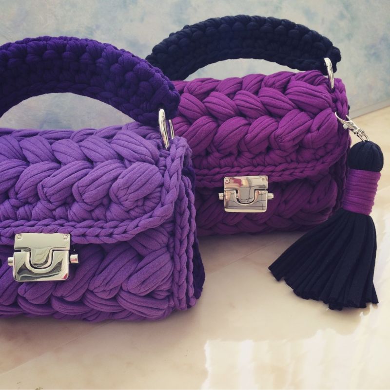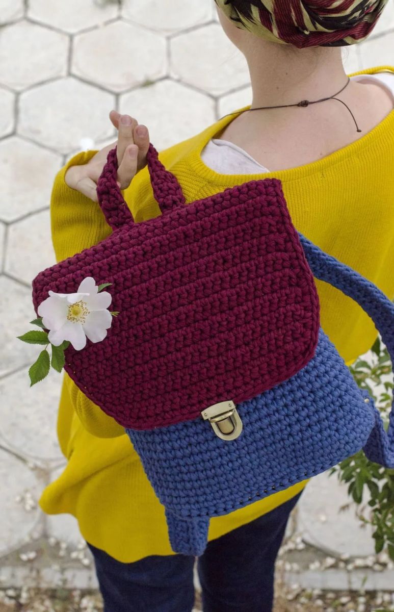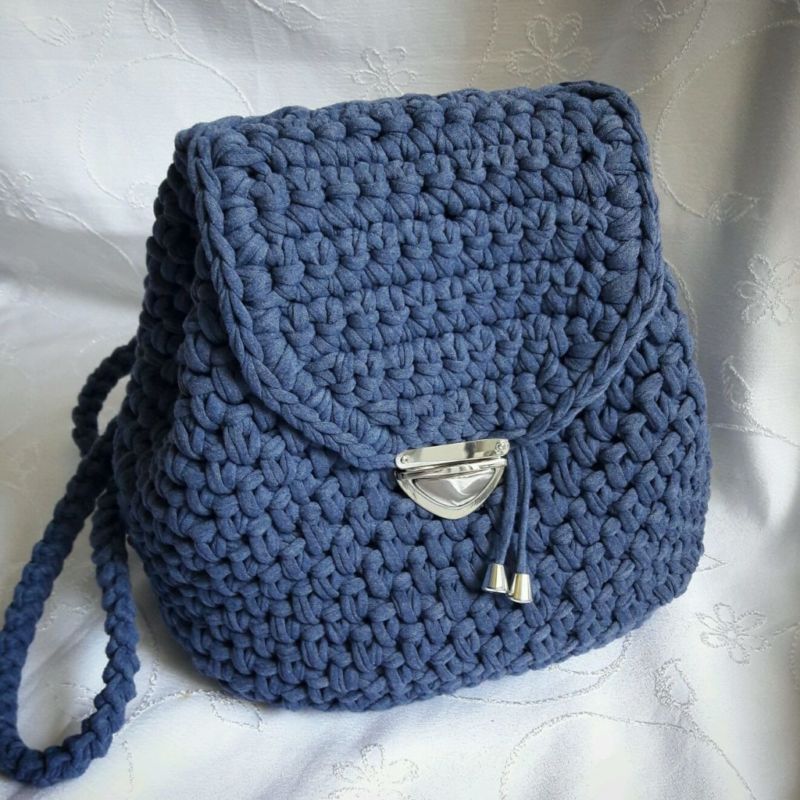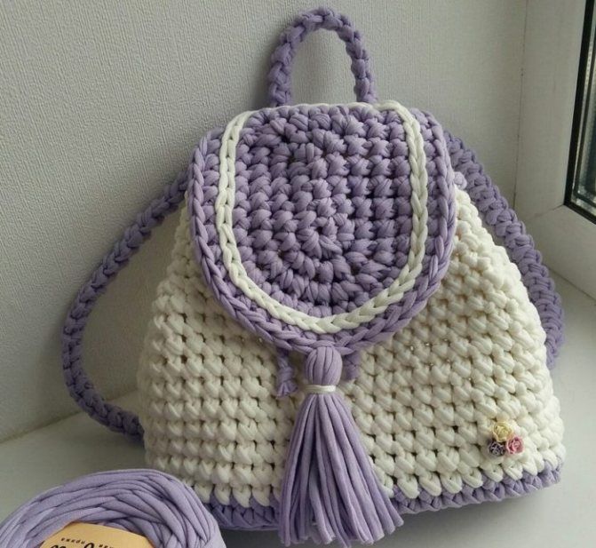 При конструирането на модела ще получите четири части: основната част, под формата на правоъгълник; дъното на овална форма; капака; джоб. Дръжките за раницата се плетат отделно, с необходимата дължина. Всички части са ушити и декорирани с аксесоари.