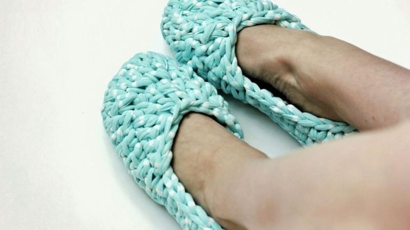 Можете да направите тези чехли, като плетете на една кука долната част и плетете страните с игли. Трябва да изберете размер. Нарисувайте очертанията на стъпалото на лист хартия и измерете разстоянието от пръстите до петите. Обиколката се измерва в най-широката точка (мястото, където се намира костта на палеца).