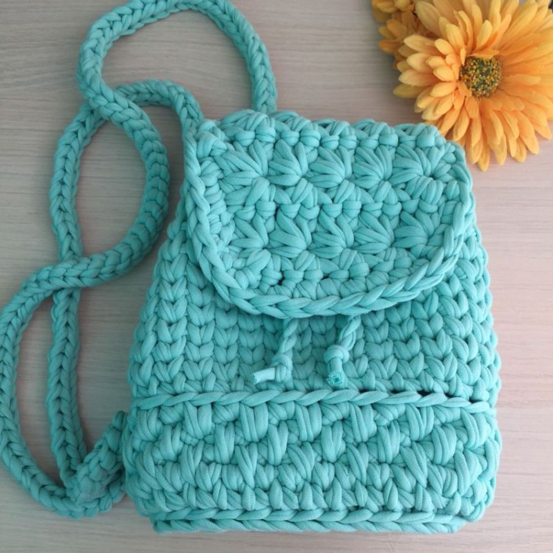 Моделът ще бъде стегнат и ще запази формата си добре поради обемния характер на преждата. Моделът за раницата е по-добре да се използва най-простият. Изглежда добре в готовия модел.