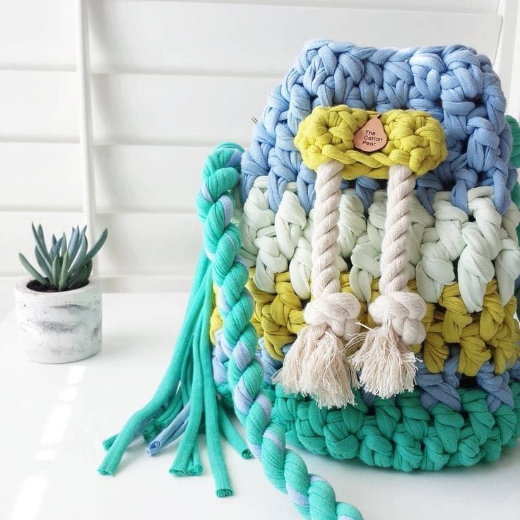 Плетената раница е модерен и полезен аксесоар. Тя може да бъде многоцветна, ярка, украсена с големи копчета или малка играчка. Не изисква специални грижи: просто го измийте със сапунена вода.