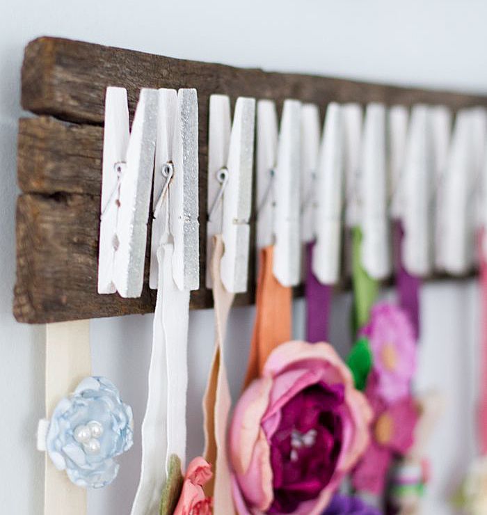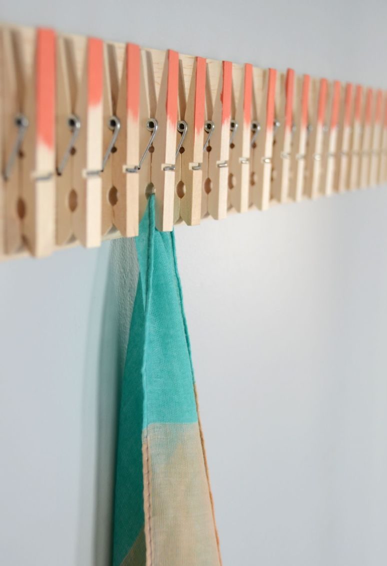 Прикрепете едната страна на клечките за дрехи към дъската с лепило или малък пирон и закачете леките си вещи на закачалката.