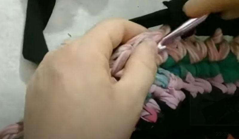 - Направете около 6 или повече шева. Ограничението ви ще бъде къде ще бъде поставен килимът в бъдеще. За да изчислите, разделете ширината на крайното парче на 2 и извадете това число от дължината. Обърнете внимание, че преждата е разтеглена с около една трета!