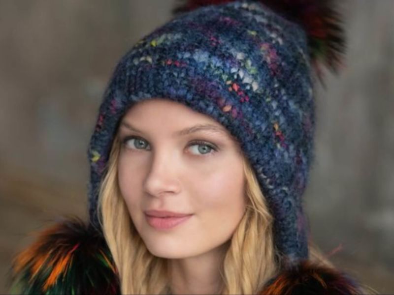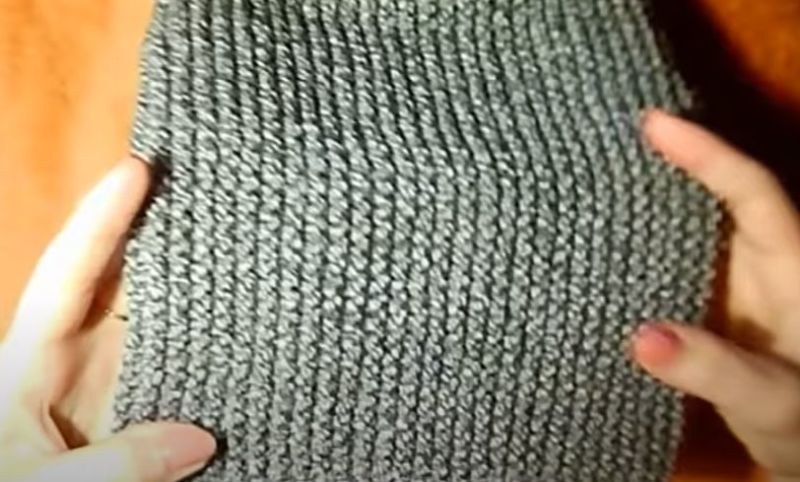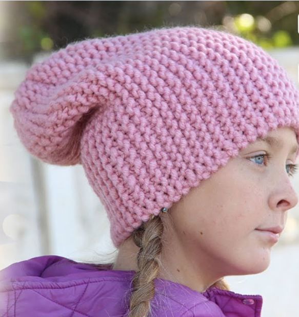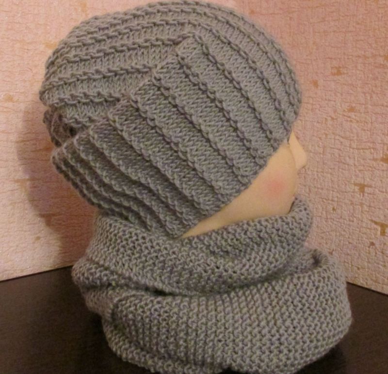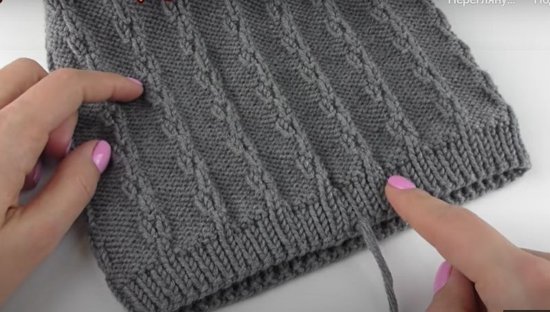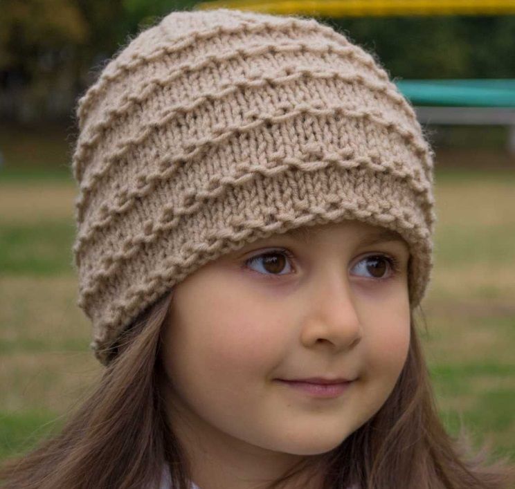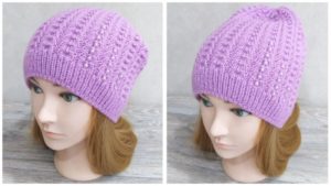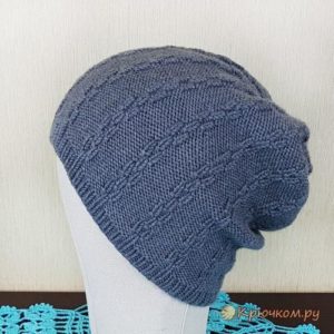 Шапката на Бини с този модел изглежда много красива. Тя може да се плете както по дължината на плата, така и вертикално. Изглежда необичайно, а шапката е по-топла заради разтягането на преждата.