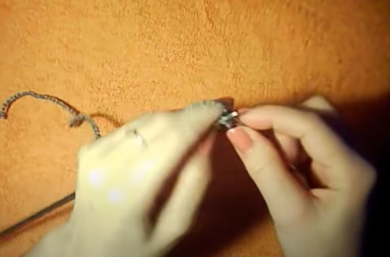 - В 17-и ред - * 2 и.л., 3 арки, отнемаме от допълнителните спици зад работата, 2 дълги арки, отнемаме 2 арки и завързваме, 1 дълга арка, 2 арки, отнемаме от допълнителните арки. С помощта на предната игла: 1 д.п., 2 и.п., 2 свалени бримки, д.п. *, 2 очи.
