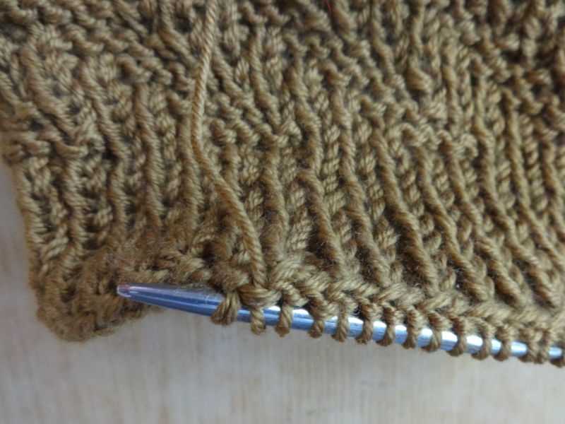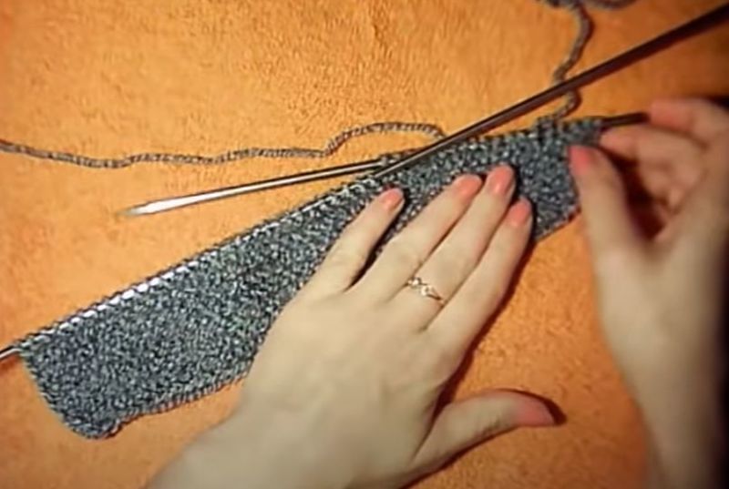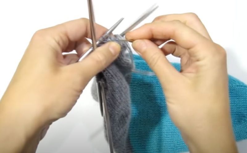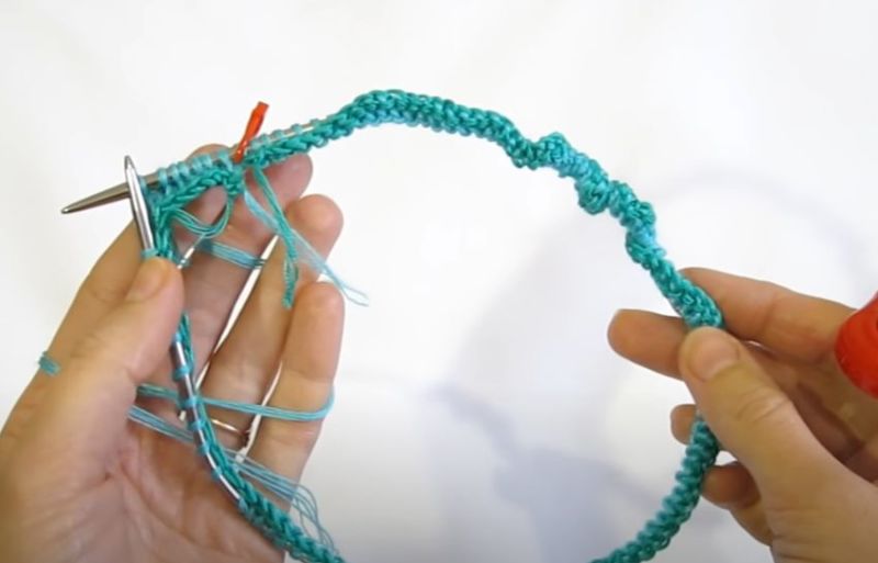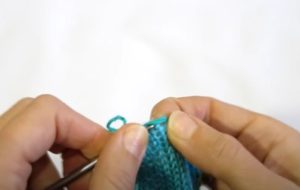 - Разгънете и в четен ред изплетете по 1 предна и 1 задна част от преждата зад работата и продължете до края на бримките.