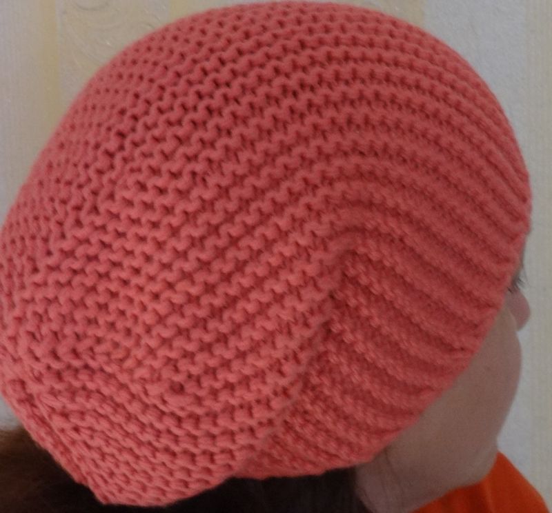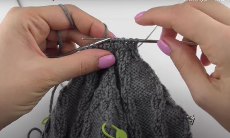 Този модел може да се плете и хоризонтално. След това редовете се плетат в средата на короната. След това броят на бримките се разделя на 8 части и трябва да правите всеки втори ред през определен брой бримки, като плетете две заедно.
