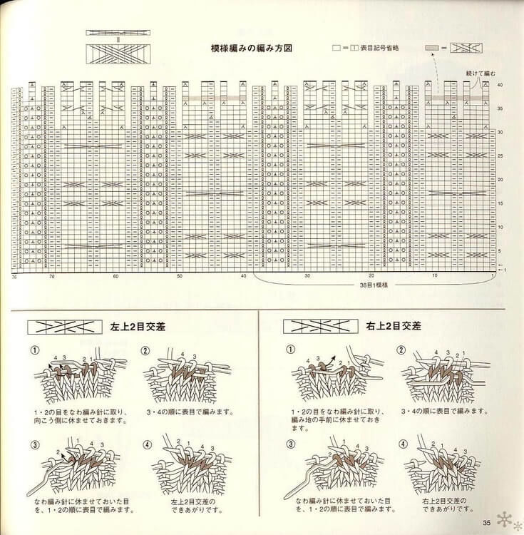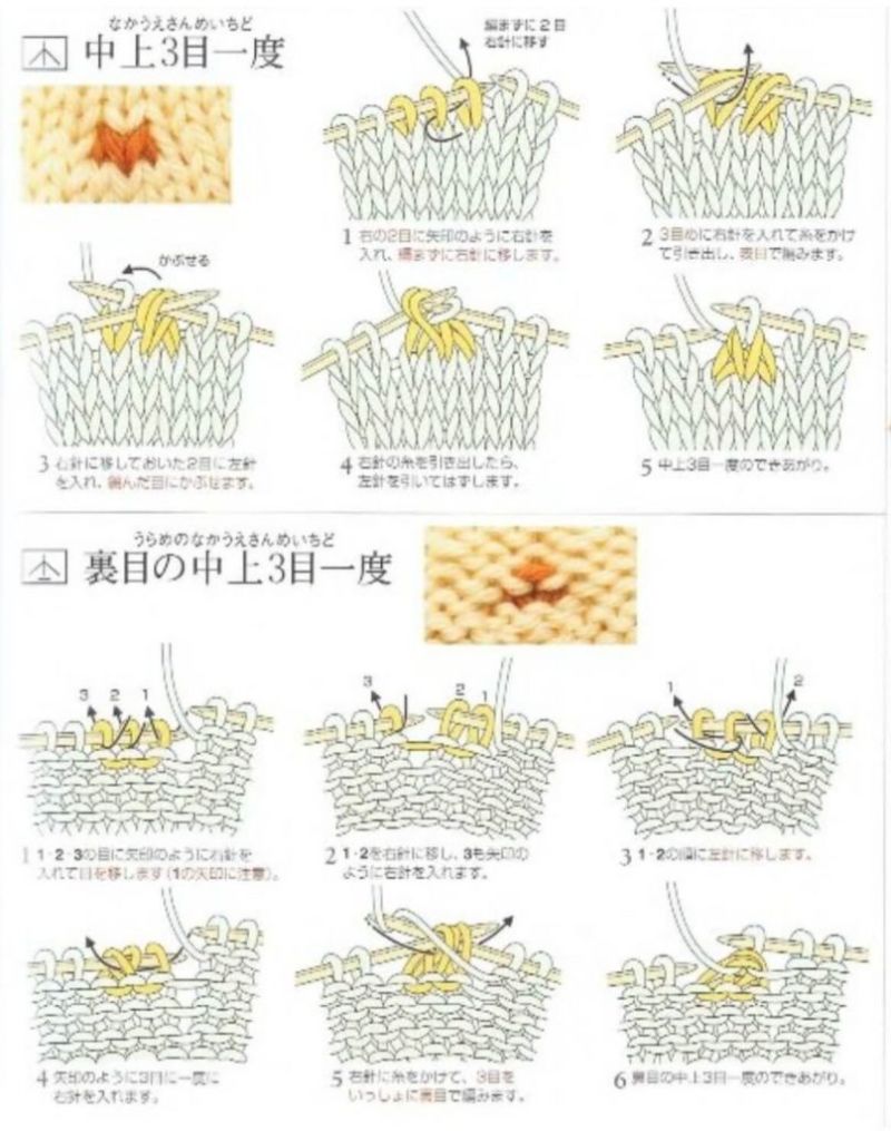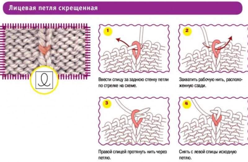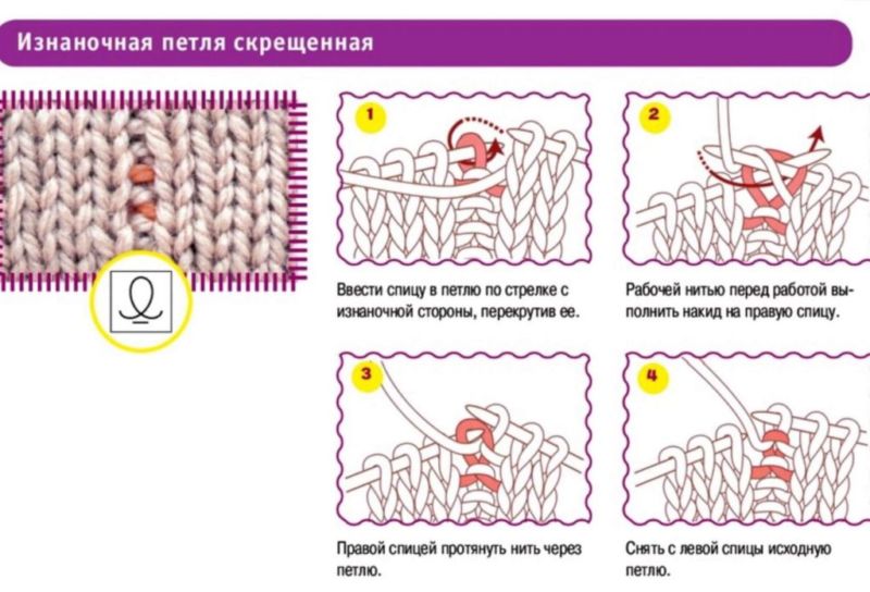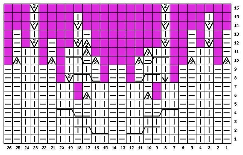 - Започвайки от деветия бод, преди да започнете работа, зашийте 2 бримки и 2 бримки на задната страна, 3 бримки и преминете над бримките, 3 бримки на задната страна, 2 бримки и преминете над три бримки на задната страна. - Това е моделът на повторение. В края на редицата - 2 бримки.
