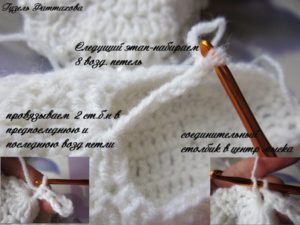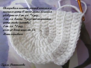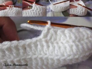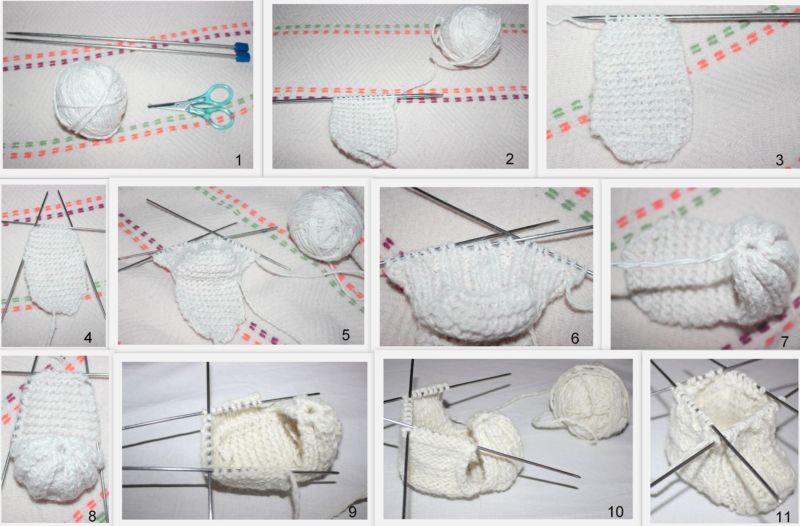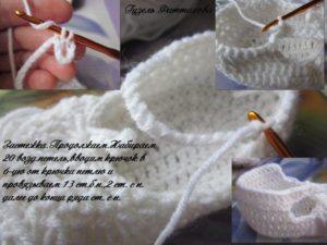 - Изработването на бебешки чехли обикновено започва с маншета. В повечето случаи тази част се плете в кръг, с ластик 1/1. Въпреки това, при някои работи, като например при обущарите, господарките се отклоняват от това правило и плетат горната част с пролука.